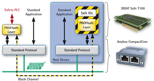 IXXAT Safe T100은 필드버스 및 산업용 이더넷 통신을 위한 HMS의 Anybus CompactCom 모듈과 함께 동작하도록 설계되었다. 이러한 솔루션에서 CompactCom은 안전하지 않은 네트워크의 전달경로처럼 동작하며, 안전 통신은 ‘블랙 채널(Black Channel)’ 원리를 이용해 구현되었다.