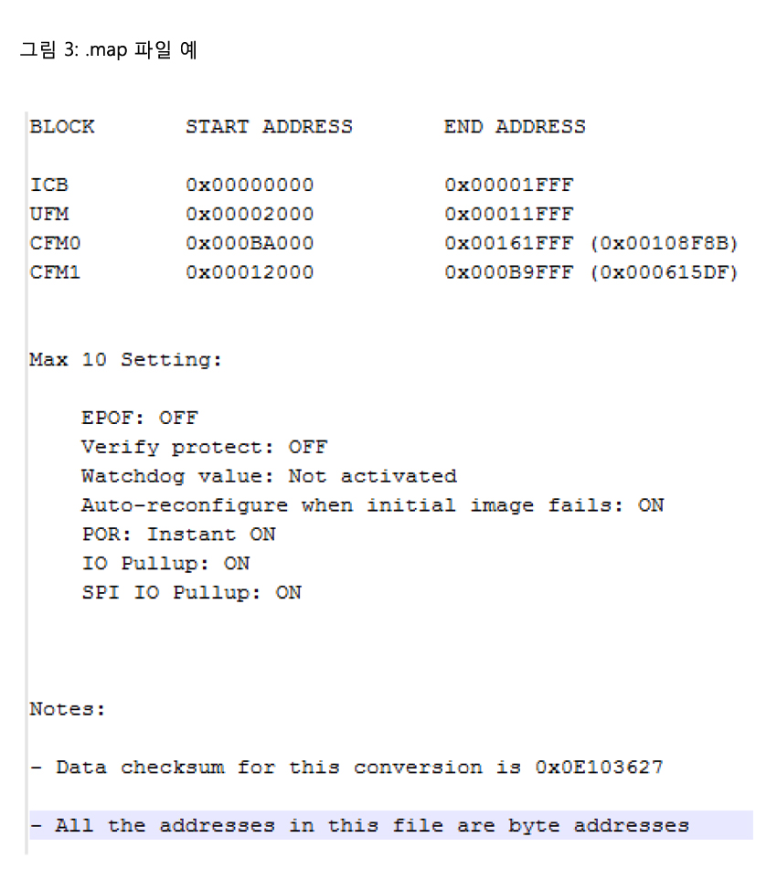 주의: map 파일에서 보여주고 있는 어드레스는 ICB 설정, CFM, UFM을 포함하고 있으나, Altera On-Chip Flash IP는 CFM과 UFM만 액세스할 수 있다. 그러므로 map 파일에서 보여주고 있는 어드레스와 Altera On-Chip Flash IP 파라미터 창에서 보여주고 있는 어드레스 사이에는 어드레스 오프셋이 존재한다는 점에 유의해야 한다.