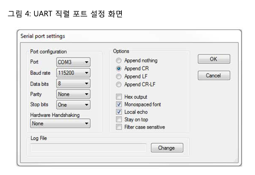 • 보드의 UART 포트가 컴퓨터로 연결되어 있어야 한다.