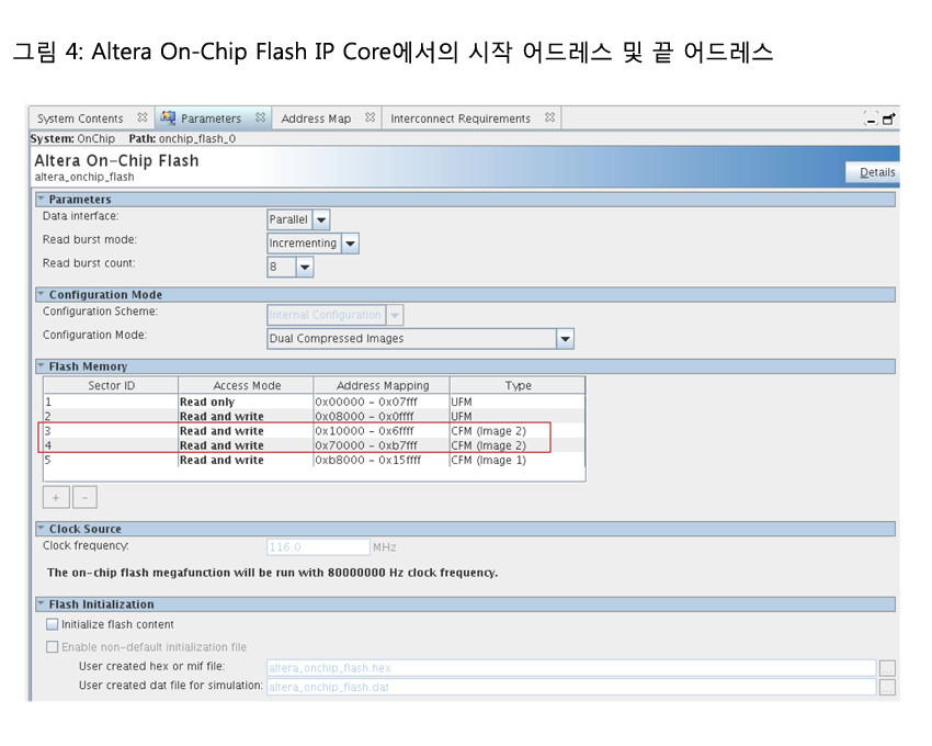 그림 5: Altera On-Chip Flash IP Core에서의 시작 어드레스 및 끝 어드레스