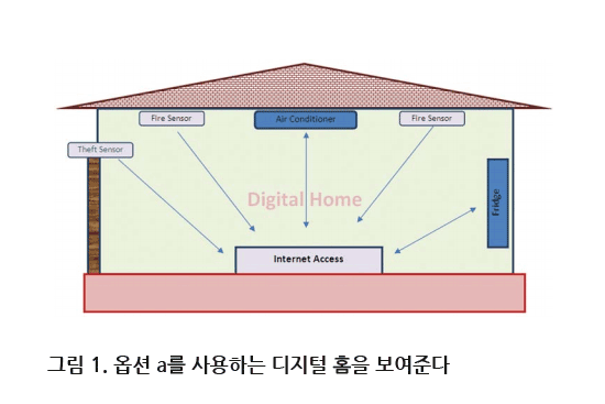1부에서는 응급 기기의 경우 왜 셀룰러 기술이 유일한 선택인지에 대해 논의한다. 유의미한 디바이스가 직접 또는 간접적으로 인터넷에 가장 많이 연결되는 디지털 홈의 경우를 살펴보자. 그림 1에 나온 디지털 홈의 경우 화재 및 도난 감지 센서가 있으며, 냉장고와 에어컨도 연결되어 있다. 그림 1에 나온 모든 가정용 디바이스는 다음중 한 가지 방법으로 인터넷에 연결할 수 있다.