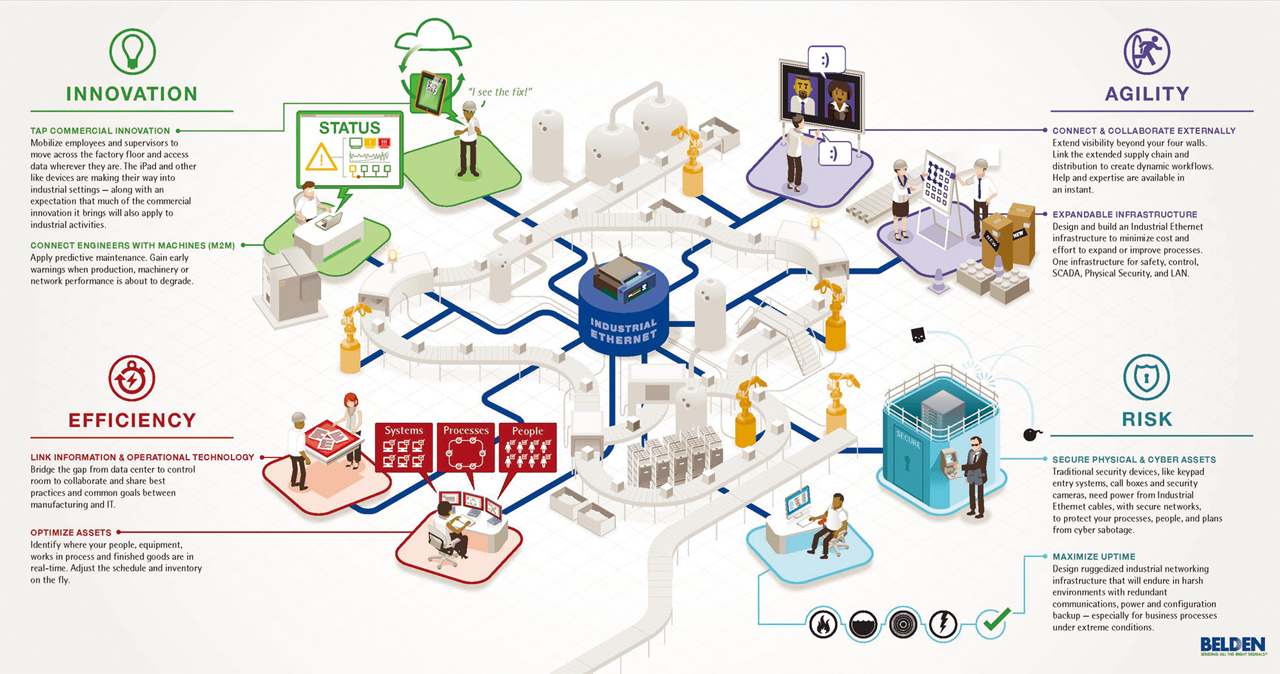 사물인터넷 국제 표준화 활동에서는 관련 산업 분야를 모두 포함하고 있기 때문에 제조 분야에서 요구되는 실시간성, 고가용성, 안전성, 보안성 등을 만족하지 못할 것으로 예상된다. 이에 스마트 제조 분야에 대한 표준화 연구그룹인 IEC SG8을 중심으로 제조 분야에서 요구되는 제반 사항을 IoT 아키텍처 프레임워크에 적극 반영할 필요가 있다. (이미지. BELDEN)