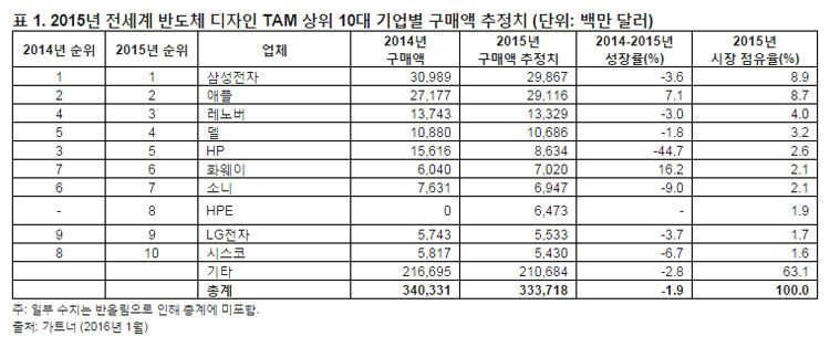 가트너의 수석 연구원인 마사츠네 야마지(Masatsune Yamaji)는 ”삼성전자와 애플은 5년 연속으로 반도체 구매 지표에서 선두 자리를 유지했지만 2014년과 2015년에 삼성전자의 디자인 TAM(Total Available Market) 성장률은 전체 반도체 시장 성장률보다 낮은 것으로 나타났다. 최근 5년 간 가장 빠르게 성장하는 기업으로 평가 받은 삼성전자와 레노버의 2015년 반도체 구매액이 하락했고 반도체 칩 제조사가 주요 고객을 통해 얻는 수익이 감소할 위험이 높아지고 있다”고 밝혔다.