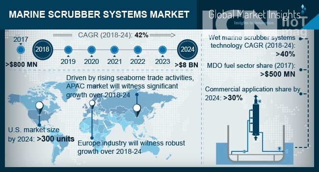 리서치앤마켓(ResearchAndMarkets)에 따르면, 선박 세정기(스크러버) 시장은 2018년부터 오는 2022년까지 글로벌 시장에서 연간 약 52%의 성장을 이어갈 것으로 나타났다. 글로벌마켓인사이트(Global Market Insights)는 선박 세정기 글로벌 시장 규모가 2017년 8억 달러에서 오는 2024년에는 80억 달러까지 늘어날 것이라고 보고 있다.