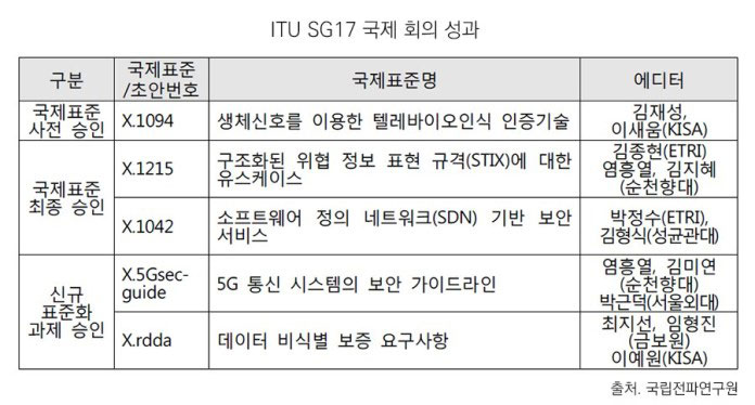 과학기술정보통신부 국립전파연구원(원장 전영만)은 스위스 제네바에서 개최된 ‘국제전기통신연합 전기통신표준화부문(ITU-T) SG17(정보보호, 의장: 순천향대 염흥열교수)’ 국제회의에서 한국 주도로 개발한 텔레바이 오인식 보안인증기술 1건이 사전 채택되었으며, 소프트웨어 정의 네트워크 보안 서비스 기술 등 사이버 보안 권고안 2건이 국제표준으로 최종 채택됐다고 밝혔다.