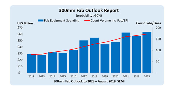 글로벌 전자 공급망을 대표하는 산업협회인 SEMI는 300mm 팹 장비 투자액이 2019년 침체기를 거친 후 2020 년에 천천히 회복될 것이라고 예상했다. 최근 업데이트 된 SEMI의 300mm 팹 전망 보고서에 따르면 300mm 팹 장비 투자액은 2021년 600억 달러를 처음으로 돌파하고 2023년에 다시 최고치를 경신할 전망이다.