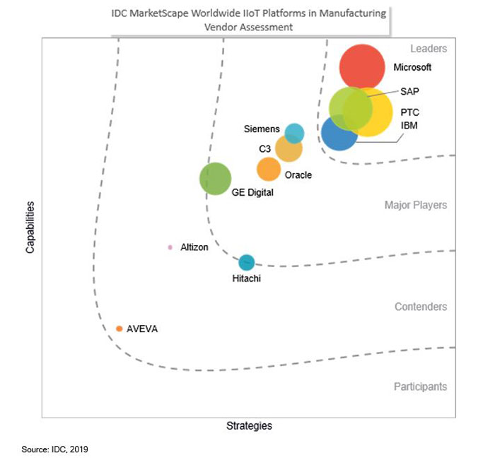 IDC는 마켓스케이프 보고서를 통해 PTC를 포함한 11곳의 IIoT 플랫폼 공급업체 역량 및 전략을 평가했다. 각 사에 대한 분석 및 평가는 공급 제품과 서비스의 견고성, 시장 진출 접근법, 사업의 안정성과 경쟁력 등의 광범위한 기준을 바탕으로 이루어졌다. 보고서에서는 특히 마이크로소프트, PTC, SAP, IBM 등 4개사를 리더 그룹으로 표기했다.