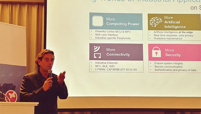 이에 최근들어 ST는 보다 강화된 산업용 시장을 위한 다양한 제품 포트폴리오와 시장 전략을 속속 출시하고 있다. 그 중에서도 ST의 주력 제품인 STM32 마이크로컨트롤러 팀에서는 STM32 기반의 산업용 애플리케이션을 이끄는 4개의 핵심 트렌드를 더욱 강력한 ‘computing power’, ‘인공지능(Artificial Intelligence)’, ‘연결성(Connectivity)’, ‘보안(Security)’ 부문으로 정하고 이를 위한 주요 제품 및 솔루션을 소개했다.
