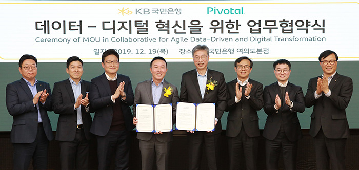 클라우드 네이티브 플랫폼 전문 글로벌 기업 피보탈 소프트웨어(Pivotal Software, Inc.)가 12월 20일 KB국민은행과 애자일 데이터-디지털 혁신을 위해 상호협력 업무협약서 (MOU)를 체결했다.
