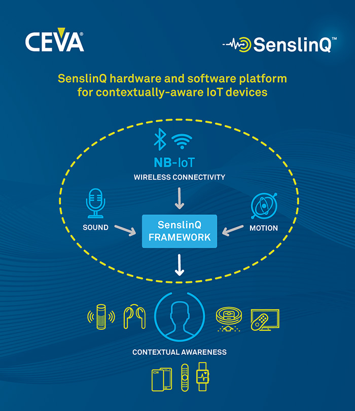 무선 커넥티비티 및 스마트 센싱 기술의 선두 라이선스 기업인 CEVA는 IoT 기기가 상황을 인지할 수 있도록 지원하는 최초의 통합형 하드웨어 IP 및 소프트웨어 플랫폼 SenslinQ™를 출시했다. 이 플랫폼은 센서 융합, 사운드 및 커넥티비티 기술을 통합한 것으로 나타났다.