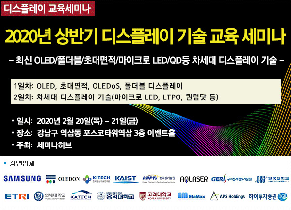 세미나허브에서는 오는 2월 20일(목)~21일(금) 이틀간 서울 강남구 포스코타워역삼에서 ‘2020년 상반기 디스플레이 기술 교육 세미나 – 최신 OLED/폴더블/초대면적/마이크로 LED/QD등 차세대 디스플레이 기술’를 개최한다.