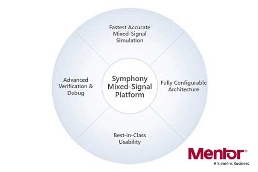 아날로그 패스트스파이스(Analog FastSPICE) 솔루션을 기반으로 하는 멘토의 ‘심포니 믹스드-시그널 플랫폼(Symphony Mixed-Signal Platform)’은 업계 표준의 HDL 시뮬레이터로 빠르고 정확한 혼성신호 검증을 제공하며, 직관적인 사용 모델, 강력한 디버깅 기능 및 구성 지원을 통해 복잡한 나노미터 수준의 혼성신호 IC를 검증한다.