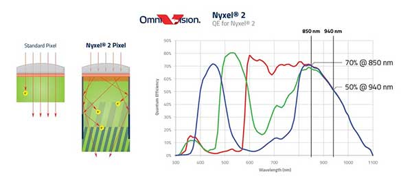 Meanwhile, OmniVision’s R&D team has continued to refine its novel silicon semiconductor architectures and processes to achieve new records in quantum efficiency (QE), with Nyxel 2 now providing a 25% improvement in the invisible 940nm NIR light spectrum and a 17% bump at the barely visible 850nm NIR wavelength.