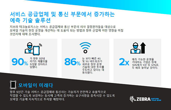 지브라 테크놀로지스(Zebra Technologies)가 현장 운영에 대한 연구 결과를 발표했다. 연구 결과에 따르면, 전세계 통신 및 기술 업계의 현장 서비스 공급업체들은 현장에서의 워크플로우를 최적화하고 혁신하기 위해 모바일 기술의 사용을 증가시킬 것으로 전망한다.