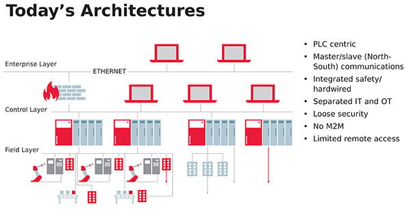 대부분의 산업 자동화 시스템은 중요한 부분에서 PLC(프로그래머블 로직 컨트롤러)로 구동하는 중앙집중식 제어 전략을 채택한다. PLC 중심의 솔루션들의 원격 액세스는 제한적이며, M2M(Machine to Machine) 커뮤니케이션에 보안을 제공하지 못할 뿐 아니라 안전 제어도 통합하지 못한다. 마스터-슬레이브 시스템에서의 자율 기기들은 센서와 액츄에이터로 작동되는 모든 입/출력 값들이 PLC와 직접 혹은 능동/수동 소자들을 통해 연결되어야 하므로 서로 상호 존재하지 못한다. (표 1 참조)