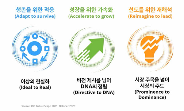 IDC에 따르면 디지털 경제로의 이동이 가속화되는 가운데 2022년까지 아시아태평양 지역 GDP의 적어도 65%가 디지털화되는 한편, 2020년부터 2023년까지 직접적인 DX 투자 규모가 1.2조 달러에 달할 것으로 전망된다. IDC는 올 한 해 전세계적으로 조직이 위기에 어떻게 대응해왔는지를 적극적으로 추적해왔다. 국내 시장을 포함해 아태지역은 기술투자를 통해 신속하게 회복의 다음단계로 이동하며 경쟁에 앞서나가는 모습을 보였다. 기술투자를 통해 신속하게 성장을 준비하고 넥스트 노멀 시나리오를 재해석하기 위해 목표기술 중심의 비즈니스 이니셔티브에 투자하고 있는 것이다.