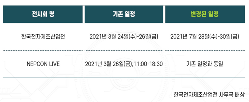 한국전자제조산업전(EMK) 사무국은 최근 코로나19 확산과 관련하여 오는 3월 24일~26일 개최 예정이었던 한국전자제조산업전을 7월 28일-30일로 연기한다고 공식 발표했다.