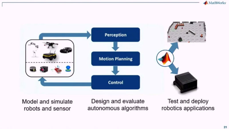 매스웍스의 매트랩 및 시뮬링크는 자율 로봇 시스템 개발 워크플로우(▲’모델 기반 설계’ ▲ ‘멀티 도메인 시스템의 모델링 및 시뮬레이션’ ▲ ‘자율 알고리즘(인식·모션계획·제어) 개발’ ▲ ‘고급 제어 기능 설계 및 최적화’ ▲ ‘가상 환경 기반 통합 시스템 테스트 및 ROS와의 연동’ ▲ ‘하드웨어 배포용 자동 코드 생성’) 전 단계에서 지원한다는 것.