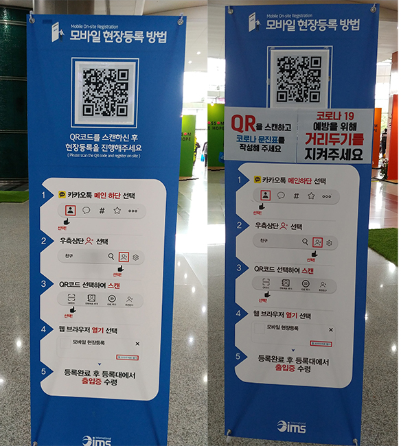 QR 코드를 통해 코로나19 관련 문진표 작성이 필수이다. 사회적 거리두기도 필수다. 전시장내 인원에 대해서도 상한선을 두고 통제를 진행한다. 따라서 입구에서 체온 및 입장확인을 진행하며, 출구에서도 바코드를 꼭 태그하고 나가야 한다.