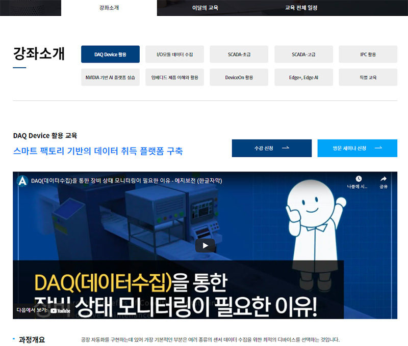 교육센터에서 제공하는 강좌는 보다 쉽고 빠르게 제품을 이해할 수 있도록 기초적인 이론부터 현재 산업의 트렌드를 고려한 최신 기술 활용 솔루션을 선보인다. 다양한 어드밴텍 제품에 대한 이론 수업뿐 아니라 실습 교육을 병행하여 산업 현장에서 교육 내용이 바로 적용 가능하도록 한다.