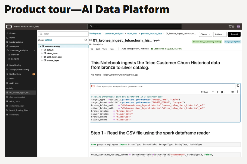 오라클 AI 데이터 플랫폼은 델타 레이크(Delta Lake), 아이스버그(Iceberg)와 같은 오픈 포맷을 활용한 데이터 레이크하우스 구축을 지원하며, 모든 데이터와 AI 자산에 대한 통합 뷰와 거버넌스를 제공하는 카탈로그 기능을 포함한다. 또한 에이전트투에이전트(A2A) 및 모델 컨텍스트 프로토콜(MCP) 등 개방형 표준을 지원해 정교한 멀티에이전트 시스템 구성이 가능하다.