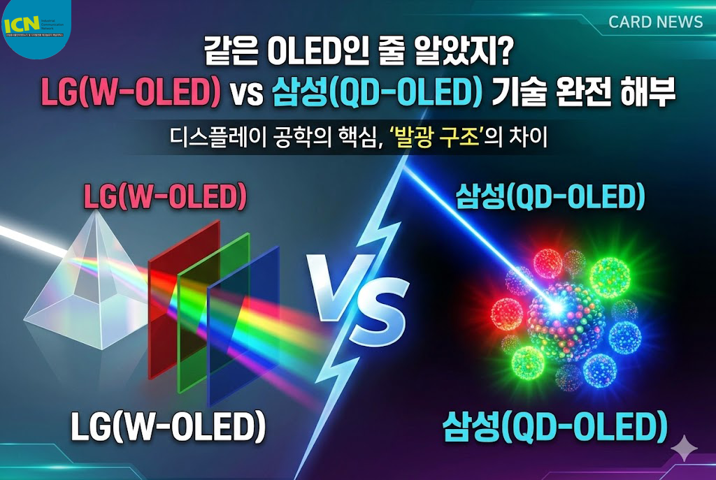 [아이씨엔 우청 기자] LG디스플레이와 삼성디스플레이는 대형 OLED TV 시장에서 각기 다른 기술 철학으로 경쟁하고 있다. LG는 백색 발광층과 컬러필터를 조합한 W-OLED(White OLED) 방식을, 삼성은 청색 발광층과 퀀텀닷 색변환층을 활용한 QD-OLED(Quantum Dot OLED) 방식을 채택했다. 두 기술은 ‘자체발광’이라는 OLED의 근본적 특성을 공유하지만, 색상 구현 메커니즘과 광학 구조에서 본질적으로 다른 접근법을 취한다.