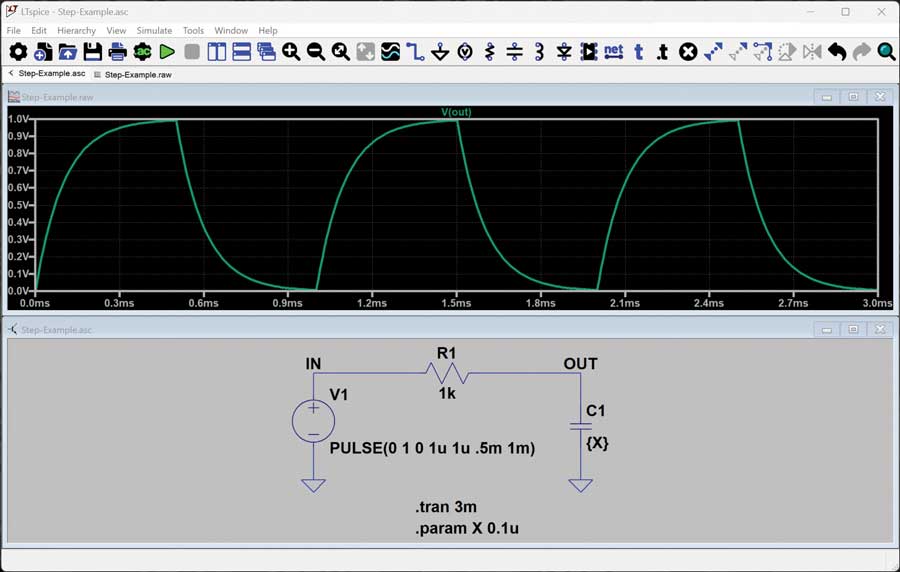 .STEP 지시문을 적용하려면 먼저 단계적으로 변화시킬 매개변수부터 정의해야 한다. 그림 1은 이를 예시한 것이다. 이 예에서는 펄스 신호가 RC 회로에 입력되고, OUT 노드에서의 반응이 파형 형태로 관찰된다. 이 예제 회로는 Step-Example.asc 파일에서 다운로드할 수 있다.
