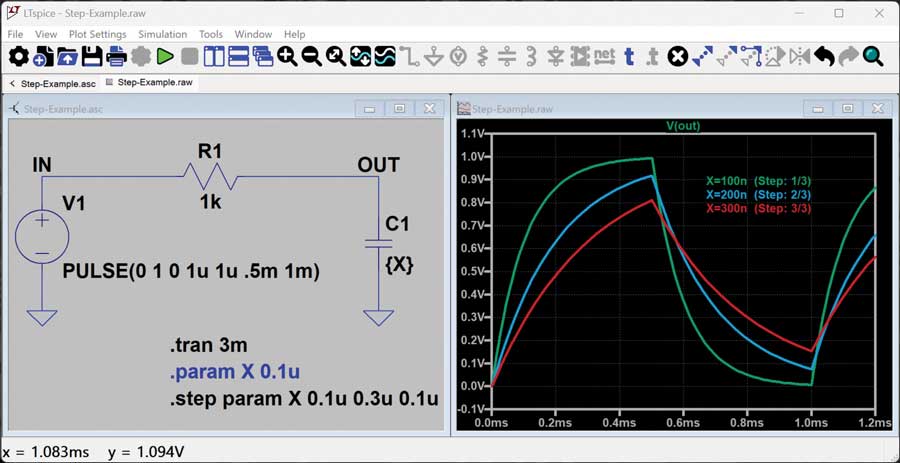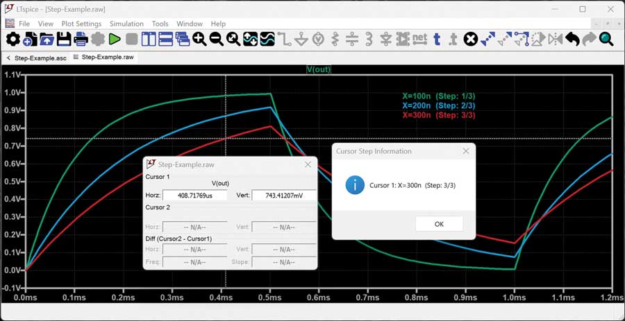 두 번째 예문에서는 X 값이 0.1u에서 0.3u까지 0.1u 간격으로 단계적으로 변화한다. 두 방법 모두 X 값이 0.1u, 0.2u, 0.3u의 세 가지 값으로 설정되는 동일한 결과를 얻는다. .STEP 지시문의 추가적인 사용 예제와 문법은 LTspice 도움말 매뉴얼의 .STEP 항목에서 확인할 수 있다.
