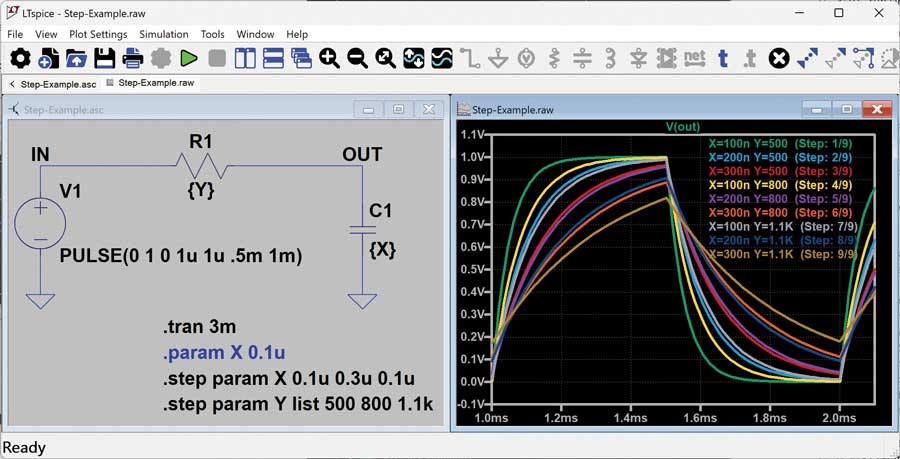 LTspice는 사용자가 시행착오를 겪어가면서 회로 설계 결정을 개선해 나가는 방식으로 활용될 수 있다. 즉, 회로의 특정 요소를 변경해 가면서 그에 따른 결과 변화를 관찰하는 방식이다. 이러한 검토 과정은 종종 수동 방식으로 수행되지만, LTspice의 .STEP 지시문을 사용하면 하나의 회로에 대해 여러 가지 변형을 자동으로 실행하고 그 결과를 하나의 파형 창에서 확인할 수 있다.