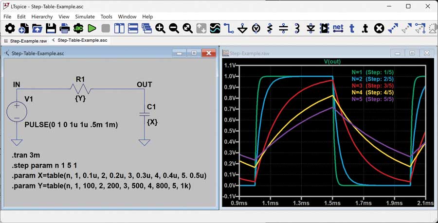 여러 개의 .STEP 지시문을 추가하는 것은 다양한 시나리오 조합을 스윕하기 위한 효과적인 방법이다. 그러나 단일 .STEP 지시문과 매개변수 표를 함께 사용하면, 시뮬레이션 실행 횟수를 줄이면서 더 넓은 범위의 값을 대상으로 보다 목표 지향적인 분석을 수행할 수 있다. 이와 관련된 예제 회로는 Step-Table-Example.asc 파일에서 다운로드할 수 있다.